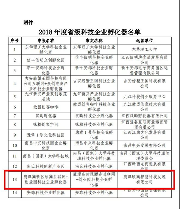2019年1月16日,按照江西省科技廳(贛科發高字〔2018〕185 號)有關規定,經縣(市)科技管理部門推薦和省科技廳組織的現場考察、專家現場核查、網上公示等工作程序,現認定鷹潭高新區頤高互聯網+創業園科技企業孵化器等 14 個科技企業孵化器為江西省 2018 年度省級科技企業孵化器。
