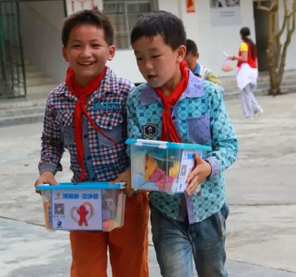 我們給每一個孩子派發了校服以及洗刷刷包(洗漱用品),并且為孩子們講解洗刷刷包的用途。